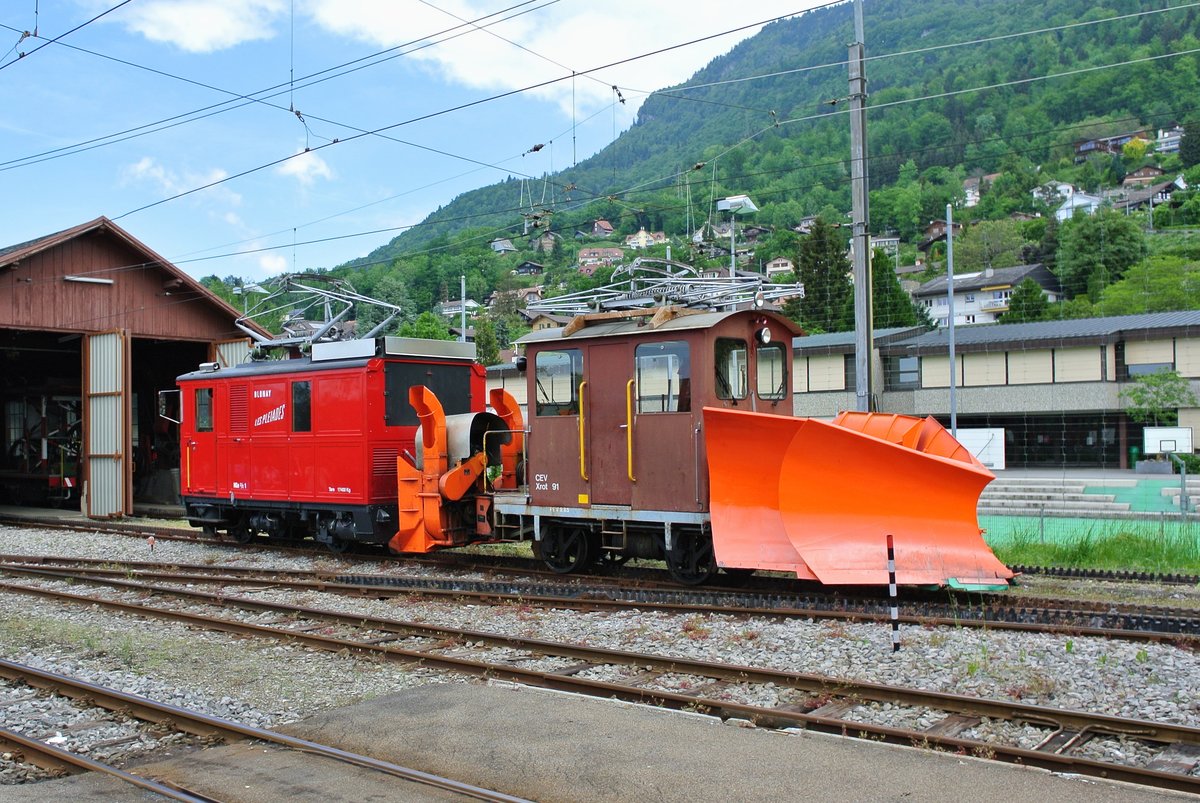 CEV Fotofahrt mit dem BDeh 2/4 Nr. 73: Die HGe 2/2 Nr. 1 und Xrot 91 wurden nach dem Foto wieder im Depot in Blonay versorgt, 16.05.2015.