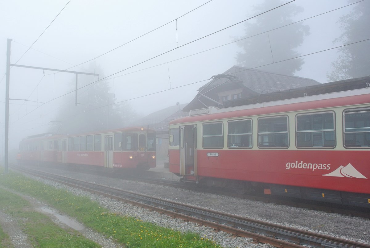 CEV Fotofahrt mit dem BDeh 2/4 Nr. 73: In Les Pléiades begegnete unser Fotozug dem planmässigen Regio welcher mit dem Bt 222 und dem BDeh 2/4 Nr. 74 geführt wurde. Aufgrund einer Weichenstörung wurde es nichts mit den beiden Zügen nebeneinander, so musste man halt ein alternatives Foto schiessen, 16.05.2015.