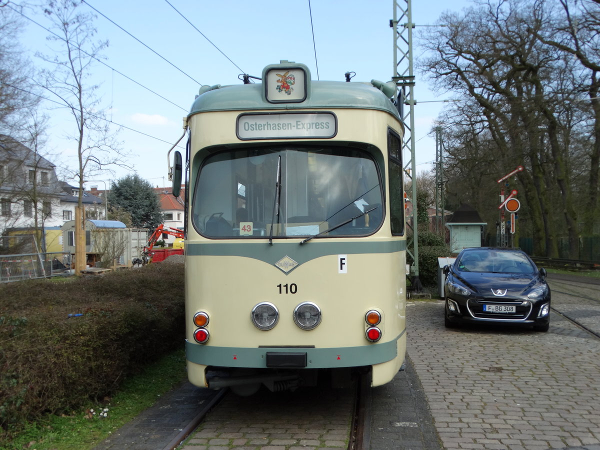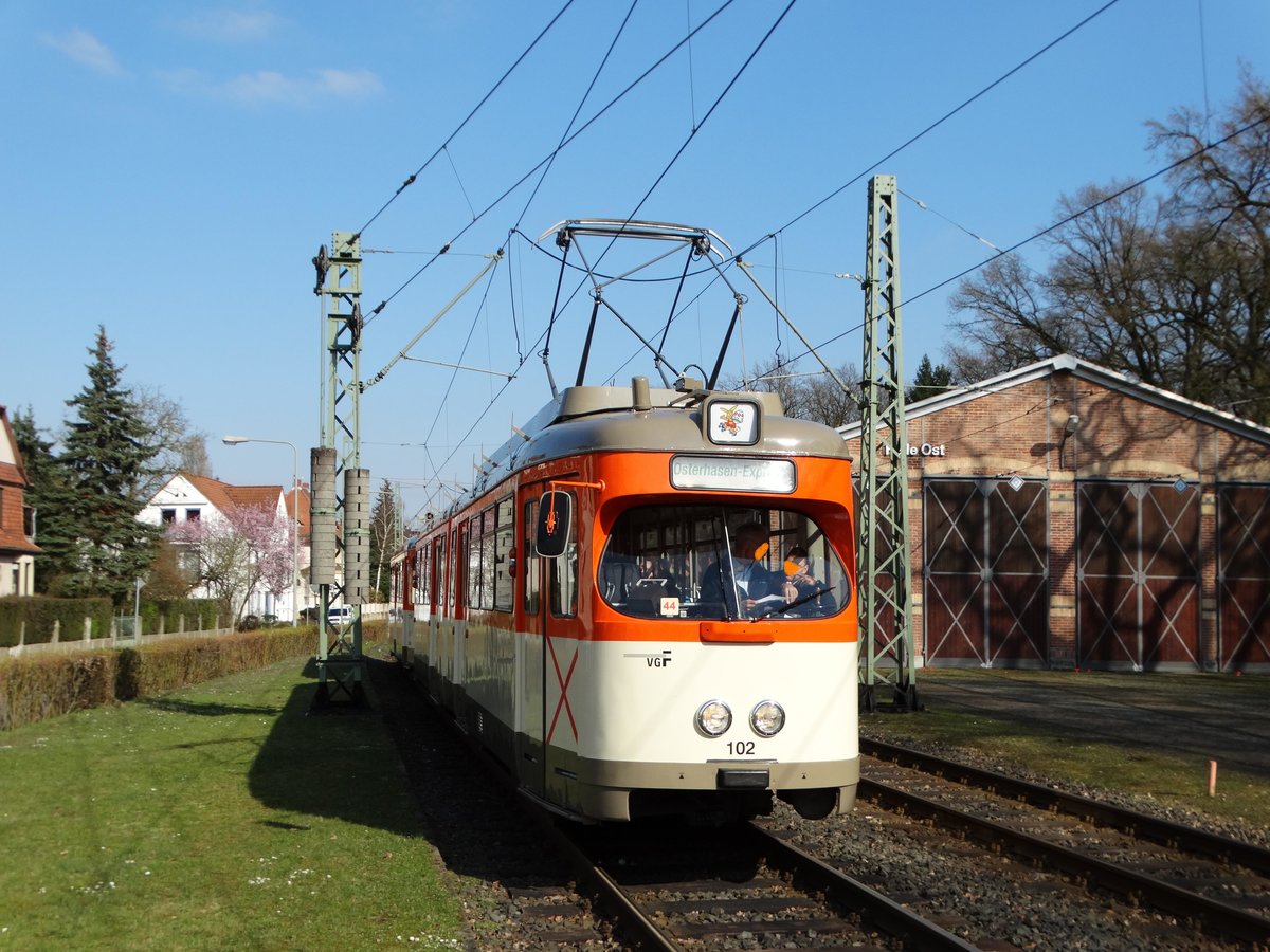 VGF Düwag M-Wagen 102 + Beiwagen 1804 am 26.03.16 in Frankfurt am Main Schwanheim als Osterhasenexpress