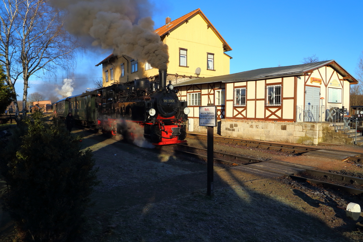 Nachdem 99 5901 am Morgen des 14.02.2015 am ehemaligen Bw Gernrode an den IG HSB-Sonderzug angekuppelt hat, setzt sie sich jetzt in Bewegung, um denselben aus dem Gleis zu ziehen, damit die dahinter wartende 99 6101 ebenfalls dieses Gleis verlassen kann, um sich danach als Vorspannlok vor den Zug zu setzen.