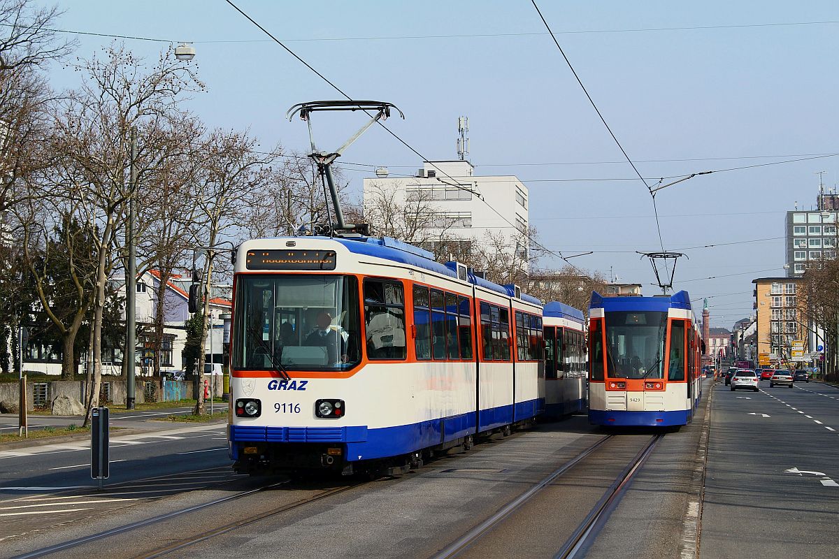 Am 1.März 2016 befährt ST 12-Tw 9116 als Linie 2 zum Hauptbahnhof mit seinem Beiwagen 9440 die Rheinstraße. Die neue Scheinwerfereinheit an der Front erscheint dem Autor doch gewöhnungsbedürftig.