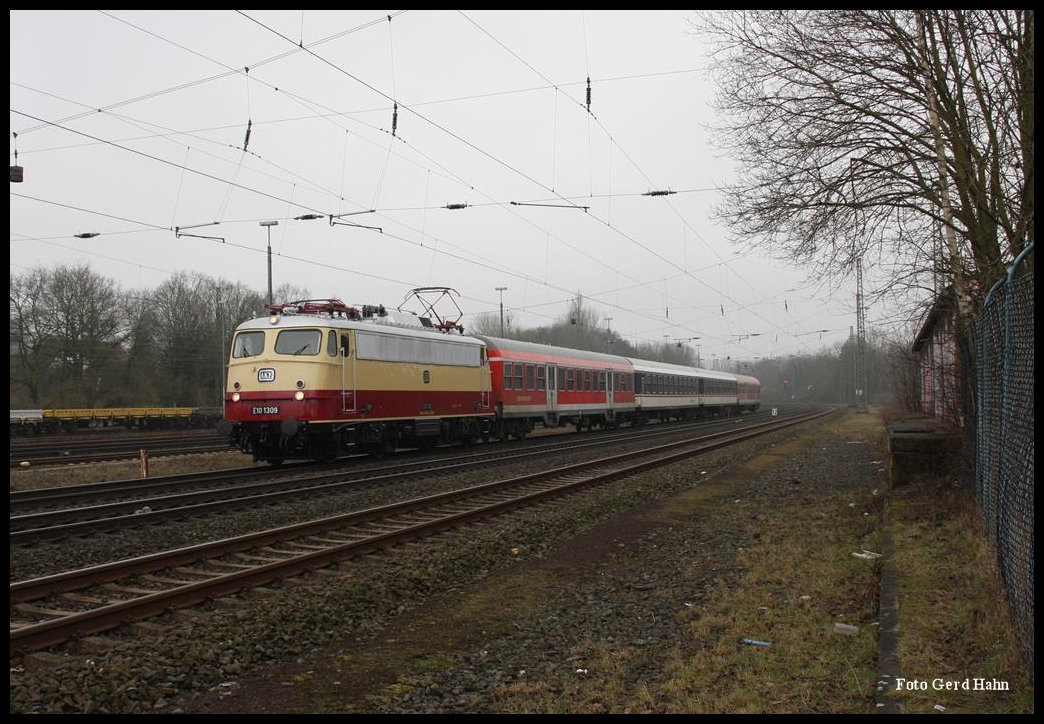 Es war wohl zum ersten Mal der Fall, dass die neue restaurierte AKE E 101309 mit einem Zug über die Rollbahn durch Hasbergen kam. Am 5.3.2016 war diese um 10,46 Uhr der Fall, als sie bei trüber Witterung mit einem Leerzug nach Delitzsch unterwegs war. Dank an dieser Stelle auch an die Hinweisgeber, die so kurzfristig mein Foto ermöglichten.