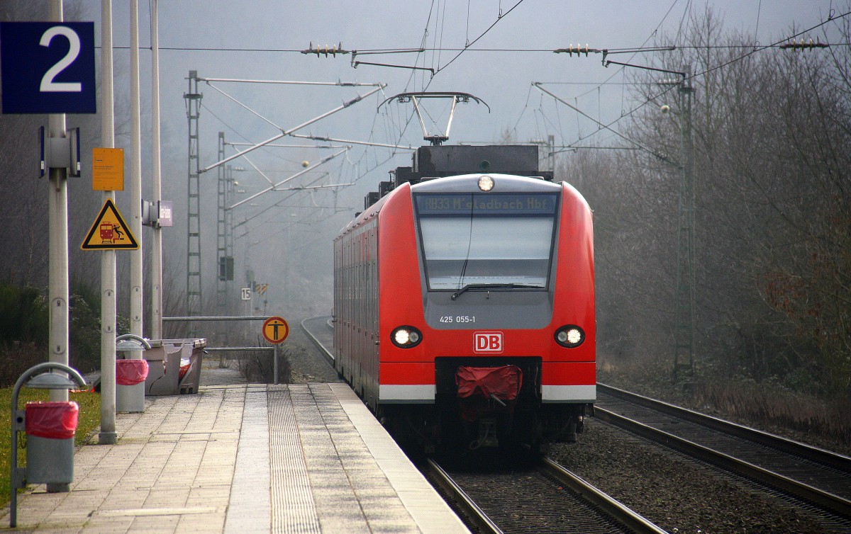 Die Rhein Niers Bahn (RB33) aus Aachen-Hbf nach Mönchengladbach-Hbf  und kommt aus Richtung Aachen-Hbf,Aachen-Schanz,Aachen-West,Laurensberg,Richterich,Kohlscheid,Herzogenrath,Hofstadt,Finkenrath,Rimburg und fährt in Übach-Palenberg ein und fährt dann weiter in Richtung Zweibrüggen,Frelenberg,Geilenkirchen,Süggerrath,Lindern,Brachelen,Hückelhoven-Baal,Baal,Erkelenz,Herrath,Beckrath,Wickrath,Rheydt.
