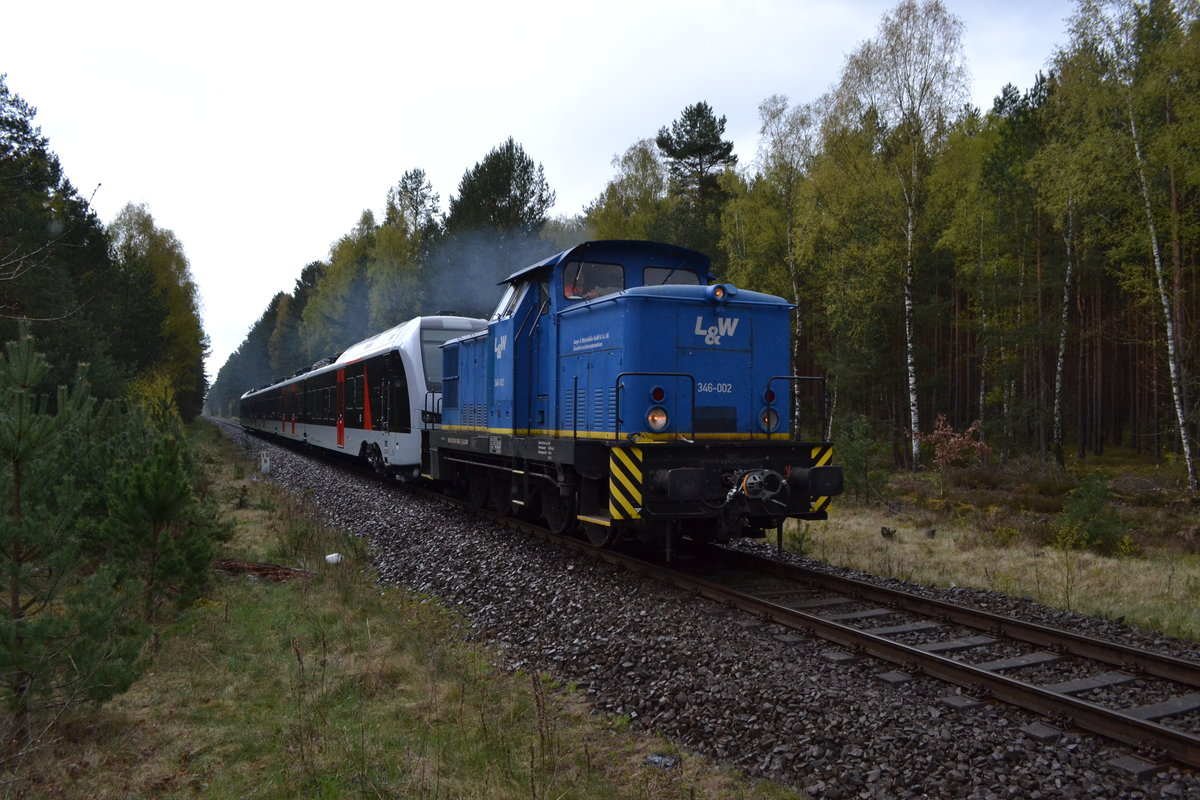 BR 346 L&W überführt BR 429 Abellio auf der Heidekrautbahn kurz vor dem Einfahrsignal Basdorf 28.04.2016