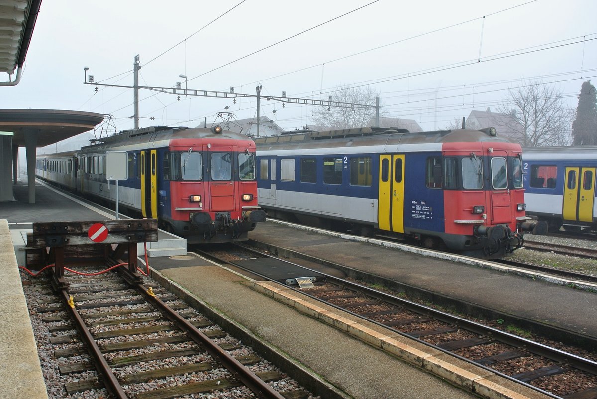 Kurz vor dem Ausscheiden der RBe aus dem Plandienst bei den OeBB; Balsthal, 07.12.2015: Beide RBe's auf einem Bild: Links der Regio nach Oensingen bestehend aus dem RBe 205, AB EWII 505 und BDt EWI 905, rechts der RBe 206.