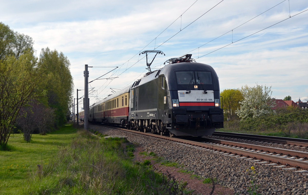 Am 22.04.16 verkehrte ein AKE von Sylt nach Dresden. Auf dem Weg in die Elbmetropole durchfährt er, gezogen von 182 596, Greppin.