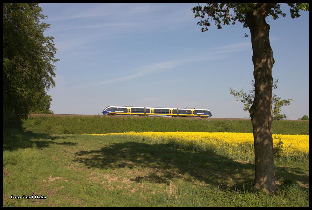 Blick auf die südlich von Wellendorf gelegene Rampe. Am 13.05.2016 war dort um 09.52 Uhr ein Talent der NWB in Richtung Osnabrück unterwegs.