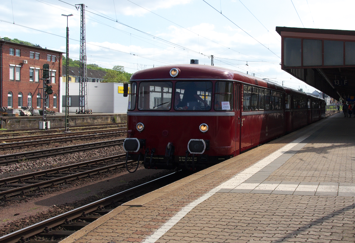 Die AKE Eisenbahntouristik veranstaltete am 14.05.2016 eine Schienenbus Sonderfahrt "Rund um Trier". Gefahren wurde von Trier Hbf. über die Eifelstrecke bis Speicher, dann zurück über Ehrang Gbf. und die Trierer Weststrecke (Güterzugstrecke). In Konz wurde die Mosel überquert und es ging über Karthaus zurück nach Trier Hbf. Die 3 Fahrten (Fahrtdauer 90 Minuten) mit der 4er Garnitur waren alle ausgebucht. Der Sonderzug geht nach Abschluss der Rundfahrten wieder auf die Heimreise nach Gerolstein. Trier Hbf. 14.05.2016