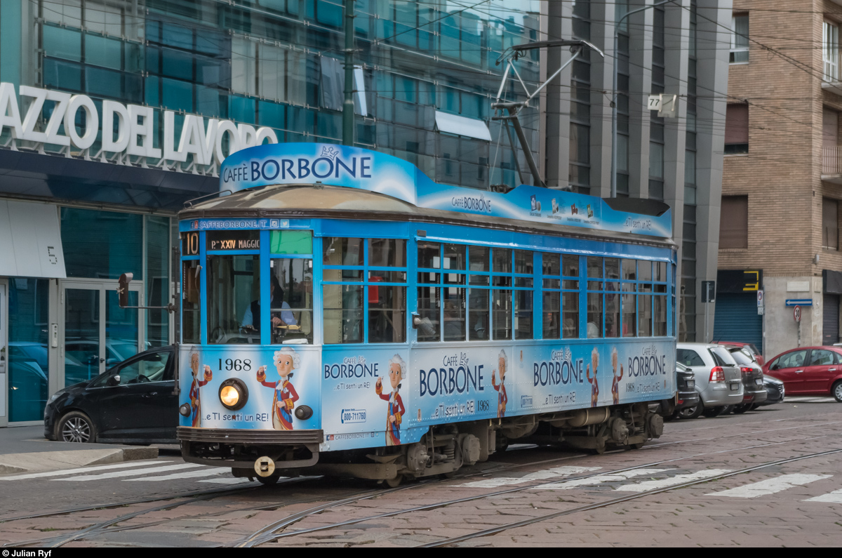 Ventotto 1968 ist derzeit als Werbetram unterwegs. Das Tram erreicht am 8. Mai 2016 die Haltestelle Milano Centrale.