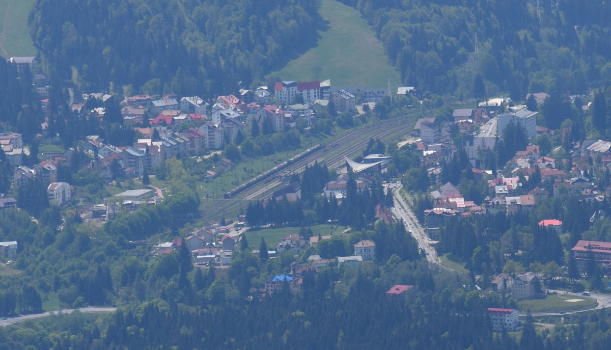 Bahnhof Predeal, gesehen aus einer Höhe von 1800 Meter ü.M. und einigen Kilometern entfernung durch die Linse eines starken Teleobjektivs. Foto vom 29.05.2016.