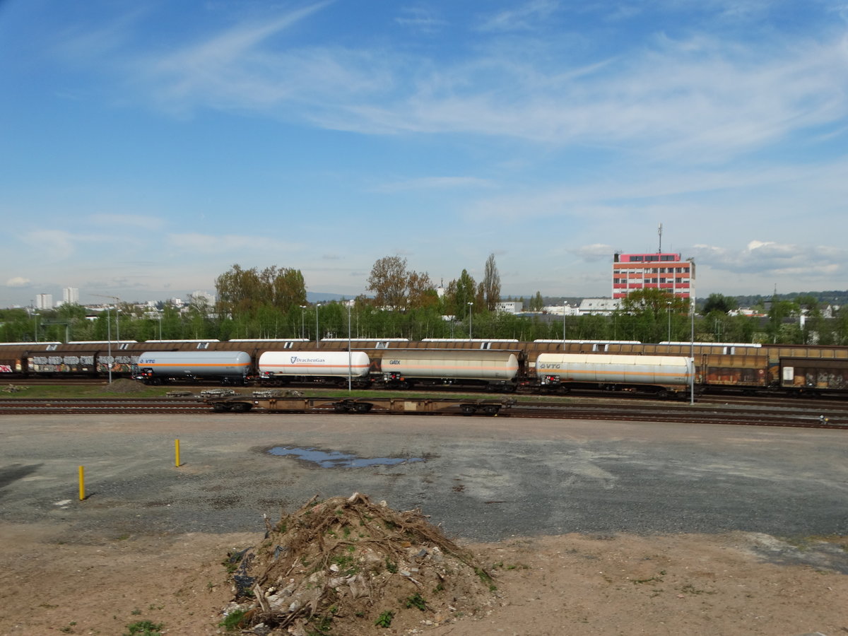 Ein paar Druckgaskesselwagen und ein Containerwagen am 30.04.16 in Frankfurt am Main Ost Bahnhof der Hafenbahn von einer Brücke aus fotografiert
