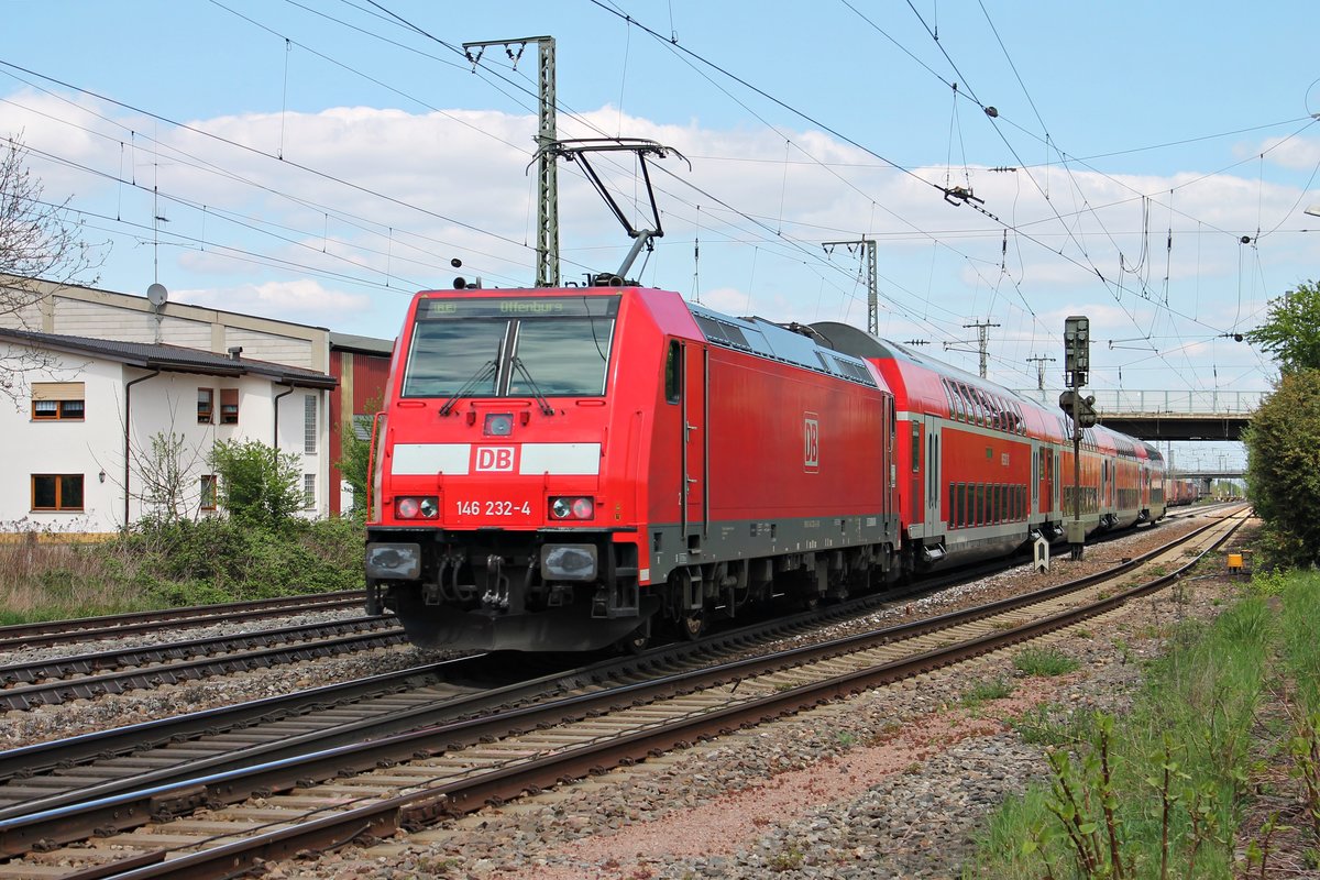 Nachschuss auf 146 232-4 am 18.04.2015, als sie mit einem RE (Basel Bad Bf - Offenburg) aus dem Bahnhof von Müllheim (Baden) ausfuhr.