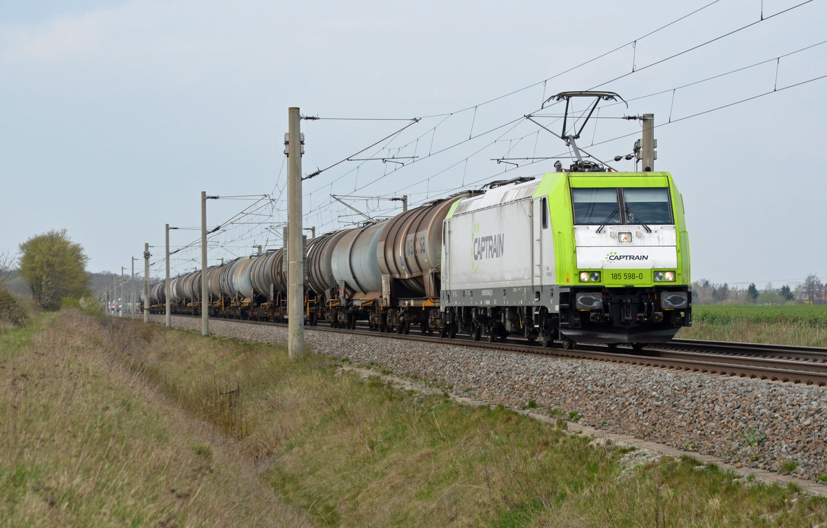 185 598 der Captrain führte am 09.04.16 einen Kesselwagenzug durch Zschortau Richtung Leipzig.