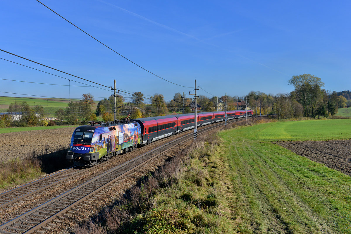Railjet 169 in der March bei Reichenburg. (27.10.2016)