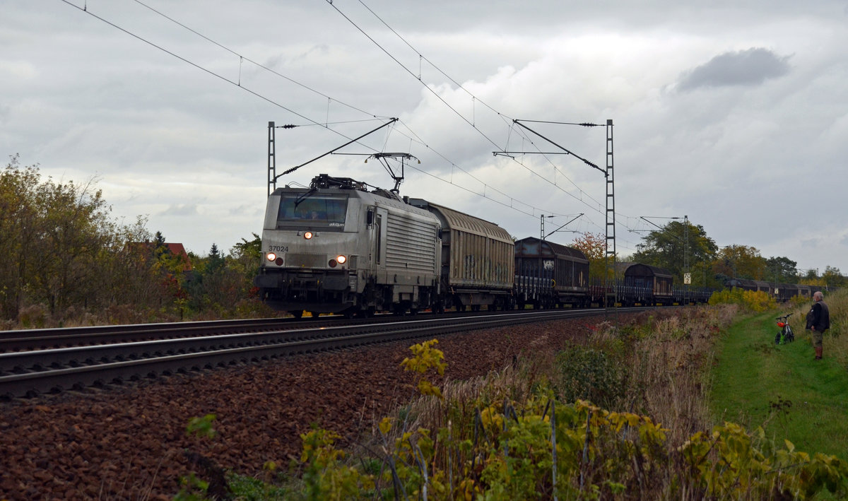 37024 der CTL führte am 29.10.16 einen hauptsächlich aus Schiebewandwagen bestehenden Güterzug durch Zeithain Richtung Leipzig. Wegen einer Zugkreuzung musste in Zeithain ein Betriebshalt eingelegt werden.
