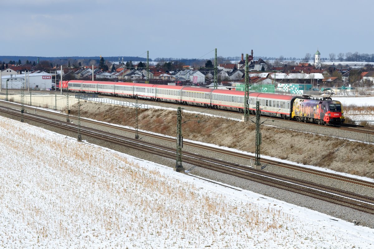 Der Ski-WM Railjet der ÖBB mit der 1116 249-4 am 12.11.16 bei Übersee am Chiemsee.