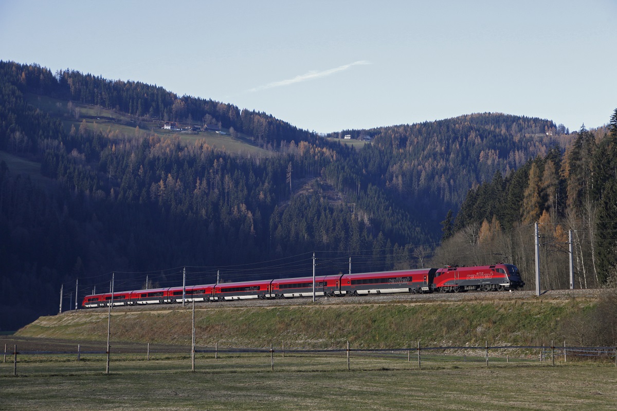 Die neue Werbelok der ÖBB 1116 157  Gemeinsam Sicher  am 12.11.16 vor einem Railjet bei Übersee am Chiemsee.
