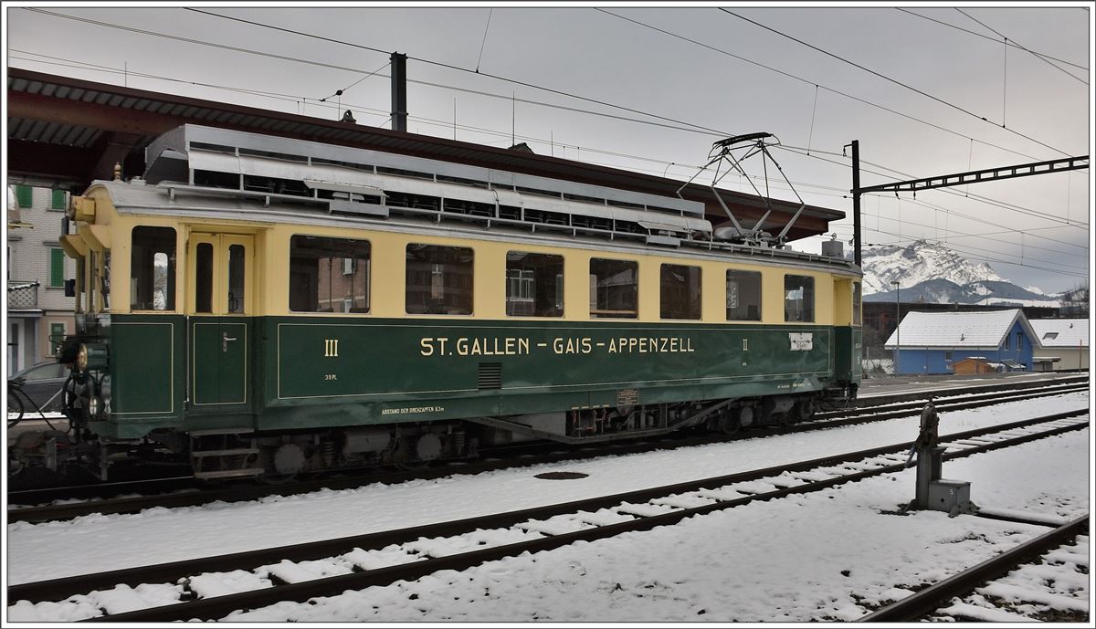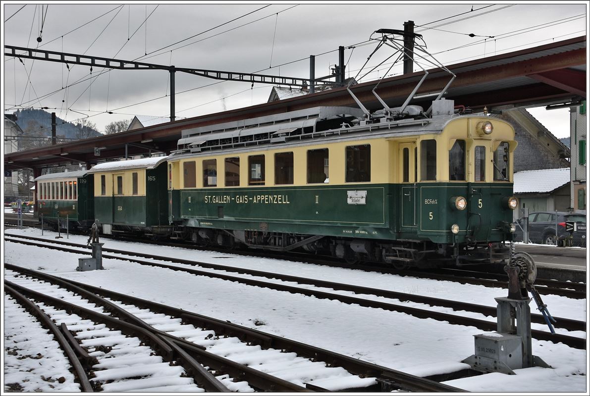 AB/SGA: Sonderzug mit BCFeh 4/4 5 + D 165 + B 119 am frühen Morgen in Gais am 13. November 2016 kurz vor der Abfahrt nach Teufen.