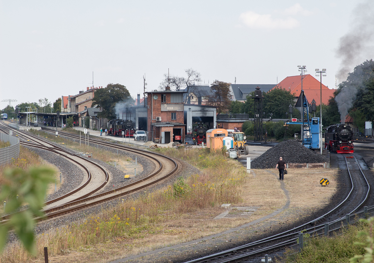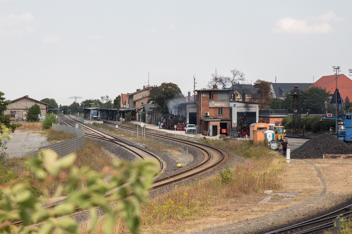 Einen Ort, wo moderne und historische Eisenbahn zusammenfinden und stellt der Bahnhof Wernigerode dar, dem am 19.08.16 ein Blick von einem etwas weiter entfernten Aussichtspunkt aus gewidmet wurde. An Dampfloks sind 99 5902 im Lokschuppen und 99 7235-7 auf dem Bereitschaftsgleis links davon auszumachen.
