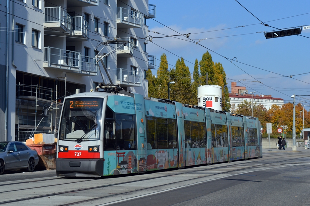 Wien, ULF B1 737 "Turkish Airlines" auf der Linie 2 in der Marchfeldstraße, 22.10.2016