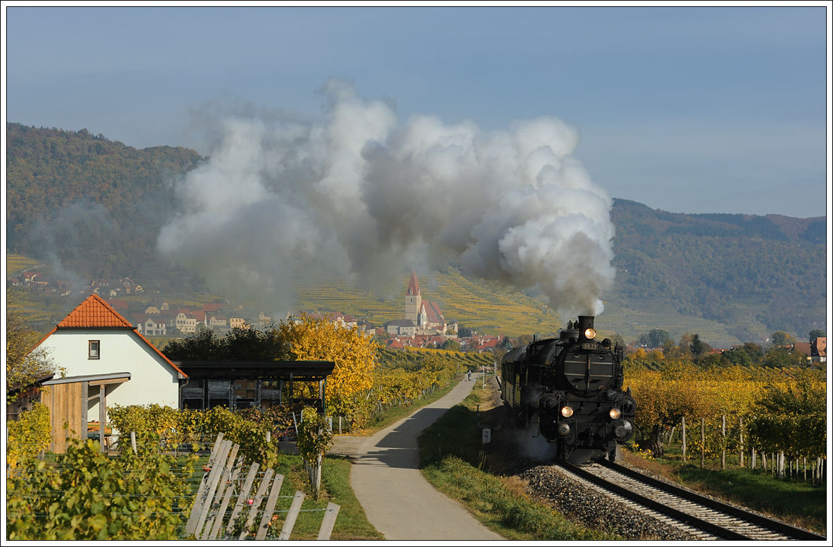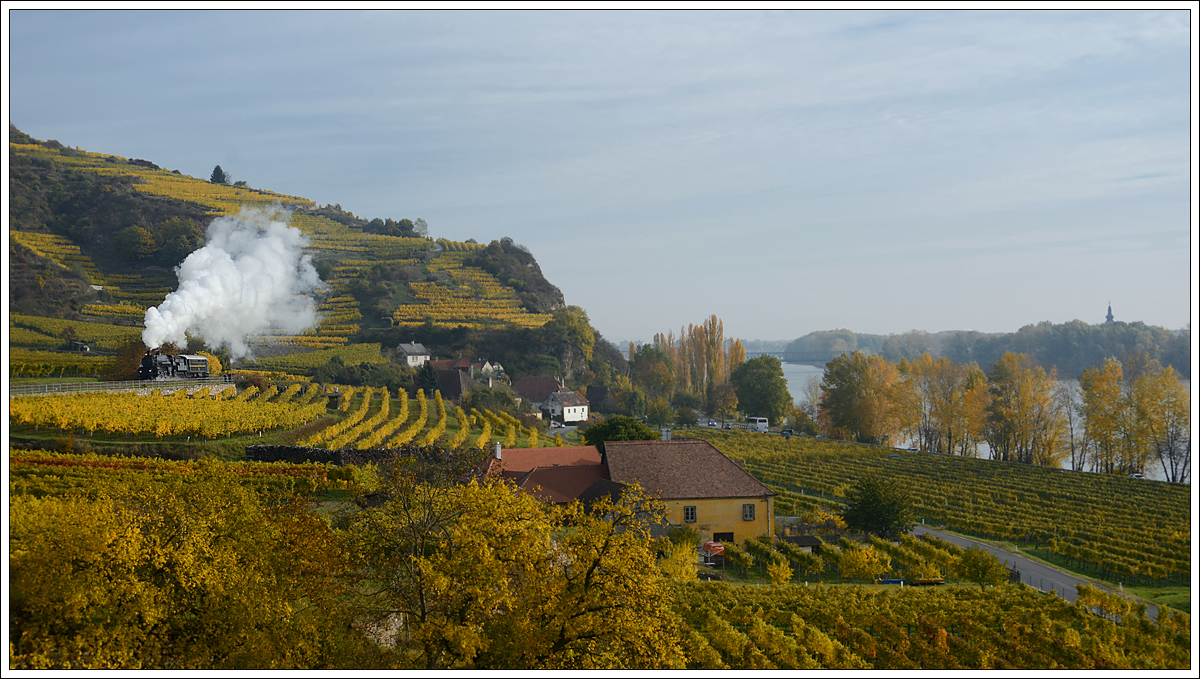 310.23 mit dem Sonderzug 17264 von Wien nach Spitz am 28.10.2016 beim Franzosendenkmal bei Dürnstein in der Wachau. Dieses Denkmal erinnert an den Sieg der österreichisch-russischen Truppen gegen die napoleonischen Truppen bei der Schlacht von Dürnstein im Jahre 1805.