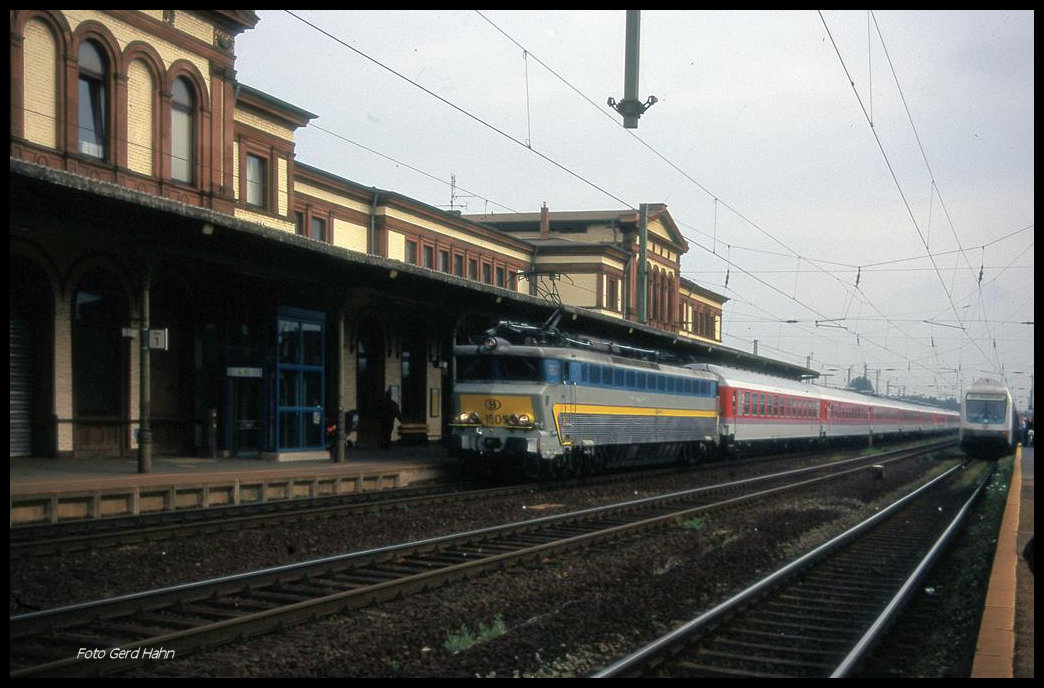 Die SNCB 1805 mit EC nach Brüssel erreicht am 21.5.1998 um 9.39 Uhr den Bahnhof Düren.