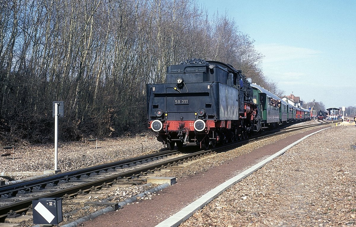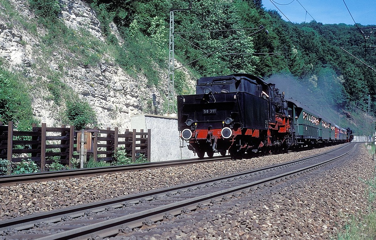 011100 war am 25.5.1997 um 15.10 Uhr mit einem stilechten Sonderzug an der Porta Westfalica in Richtung Löhne unterwegs.