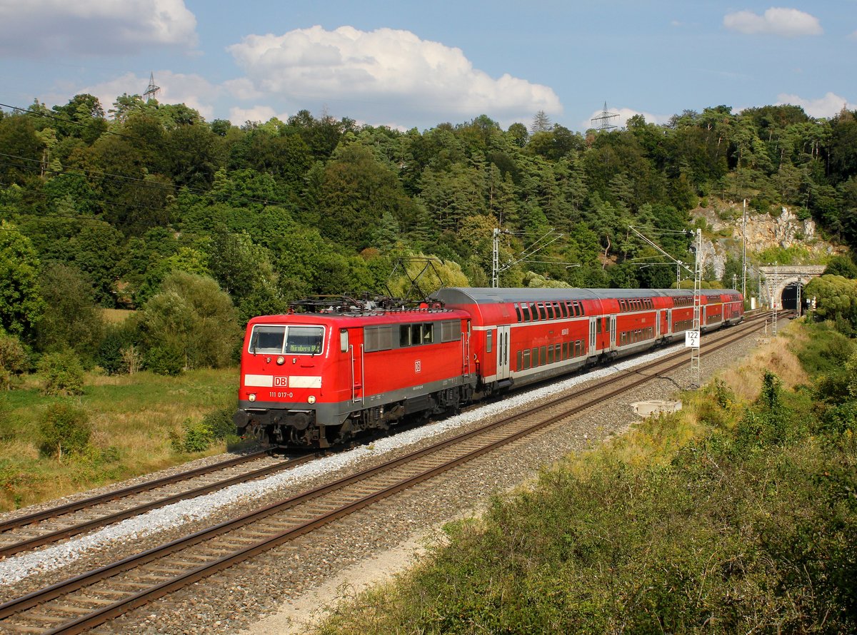 Die 111 017 mit einem RE nach Nürnberg am 10.09.2016 unterwegs bei Eßlingen.