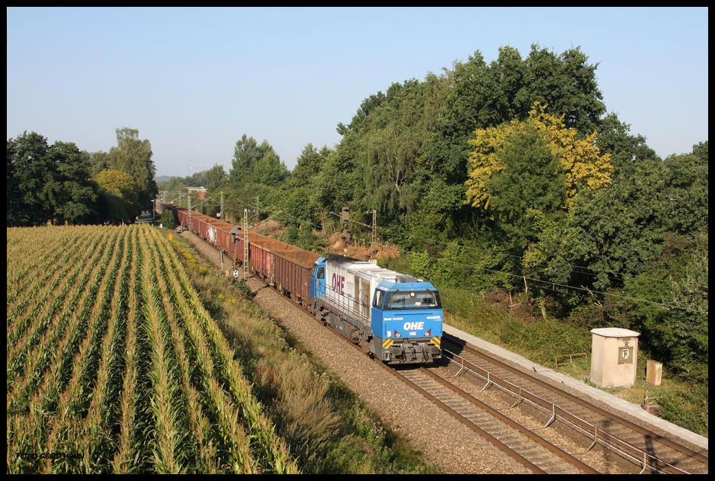 OHE 1460 ist hier am 8.9.2016 um 9.20 Uhr am Ortsrand von Hasbergen mit einem Leerzug zum Hafen in Osnabrück unterwegs, um Schrott für die Georgsmarienhütte zu holen.