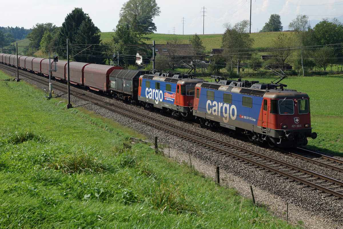 SBB: Blockgüterzug mit Doppeltraktion Re 421 zwischen Wangen a/Aare und Niederbipp am 12. September 2016. Die an zweiter Stelle eingereihte Lok dient als Werbeträger für neues Lokpersonal. Foto: Walter Ruetsch