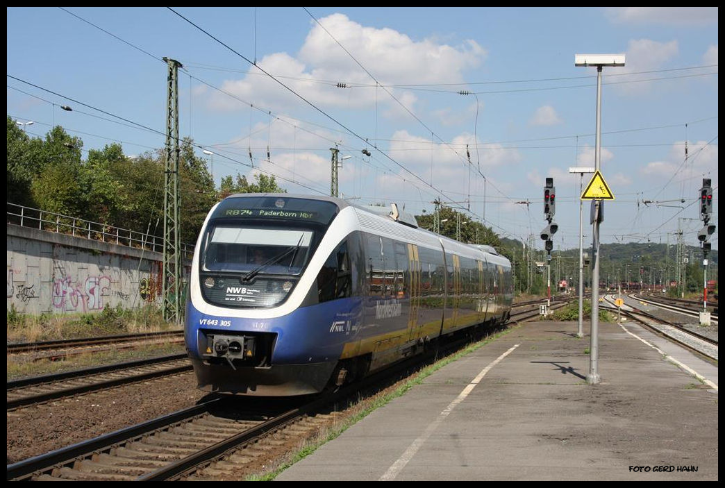 VT 643305 der Nordwestbahn fährt hier am 06.09.2016 um 14.10 Uhr auf dem Weg nach Paderborn in Brackwede ein.