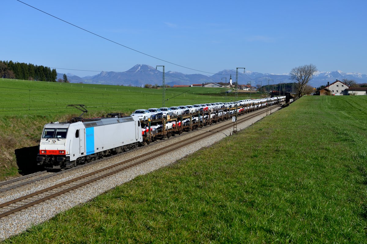 Bei Hörafing konnte die Railpool 185 636 mit dem SGAG 42388 abgelichtet werden. Audis aus dem ungarischen Werk in Györ sind auf dem Weg zu ihren neuen Besitzern. Erfreulicherweise war die Sicht klarer als am Vortage, so daß sich die Berge im Salzburger Land schön im Bildhintergrund abheben (30. März 2014).