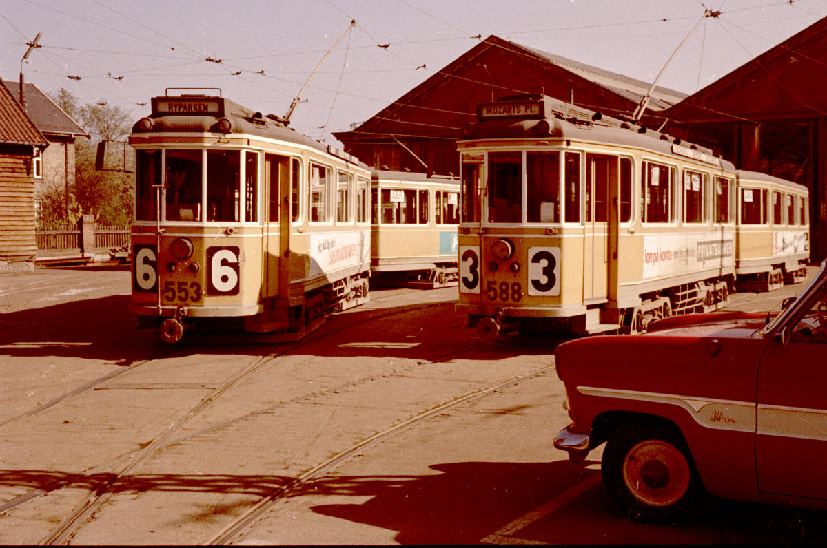 København / Kopenhagen Københavns Sporveje SL 6 (Tw 553 + Bw 15xx) / SL 3 (Tw 588 + Bw 15xx) Svanemøllen remise / Straßenbahnbetriebsbahnhof Svanemøllen am 26. April 1968. - Scan von einem Farbnegativ. Film: Agfacolor CN 17.