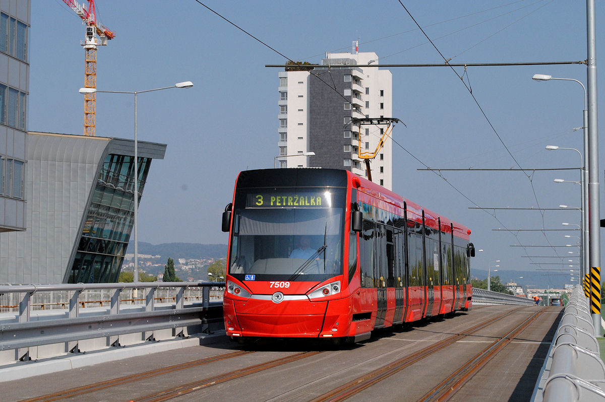 Imposant ist die im Zuge der Straßenbahnverlängerung nach Petržalka errichtete Donaubrücke, die gerade vom Tw. 7511 überquert wird. ( 14.09.2016 )