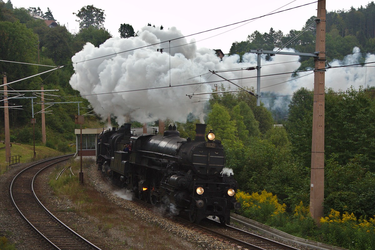Der Sonderzug SR 17085 mit der 310.23 vorne und 109.13 dahinter im Gleisbogen bei Klamm-Schottwien. (17.09.2016)