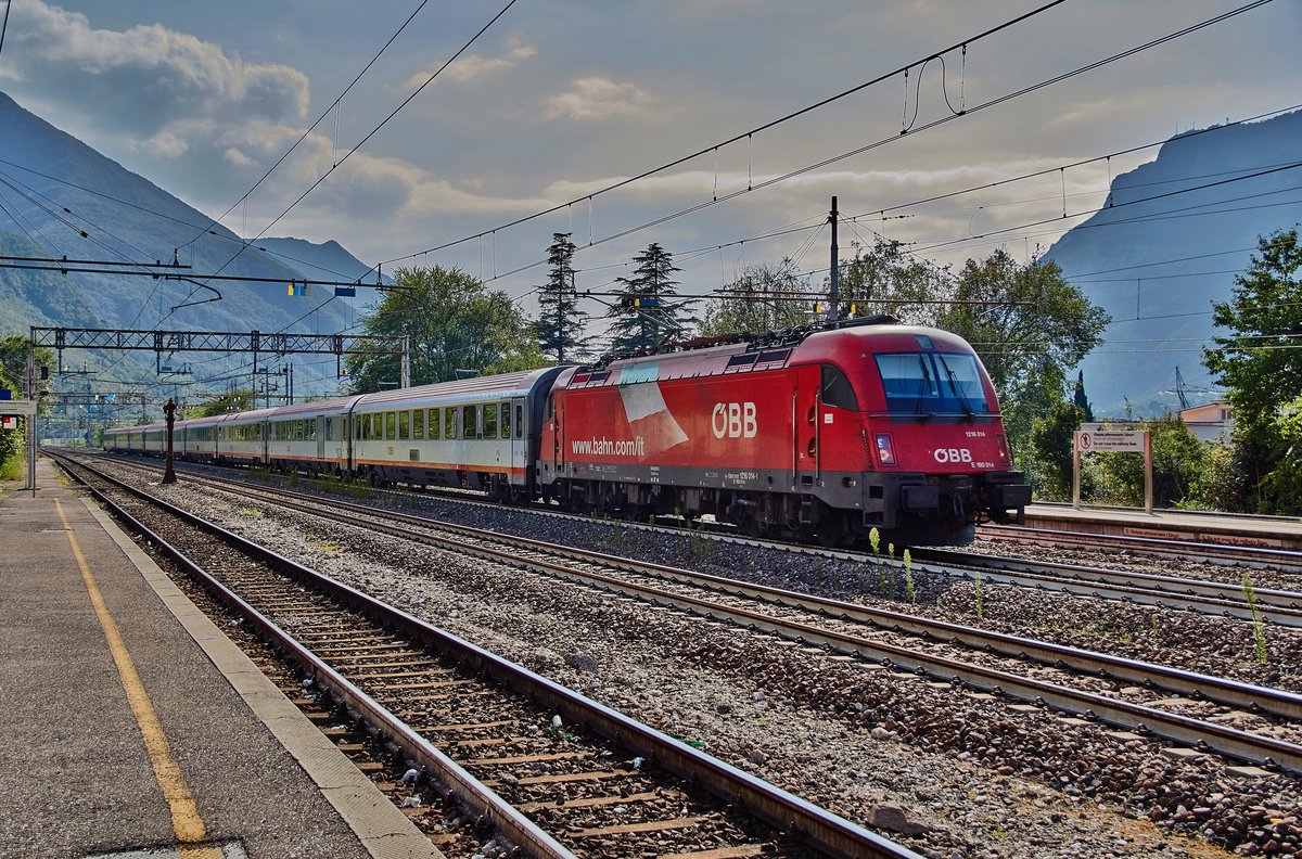 1216 014 (E 190 014) ist am 22.09.16 mit einen EC von Verona komment in Richtung Innsbruck unterwegs gesehen im Bhf.von Peri (Verona).