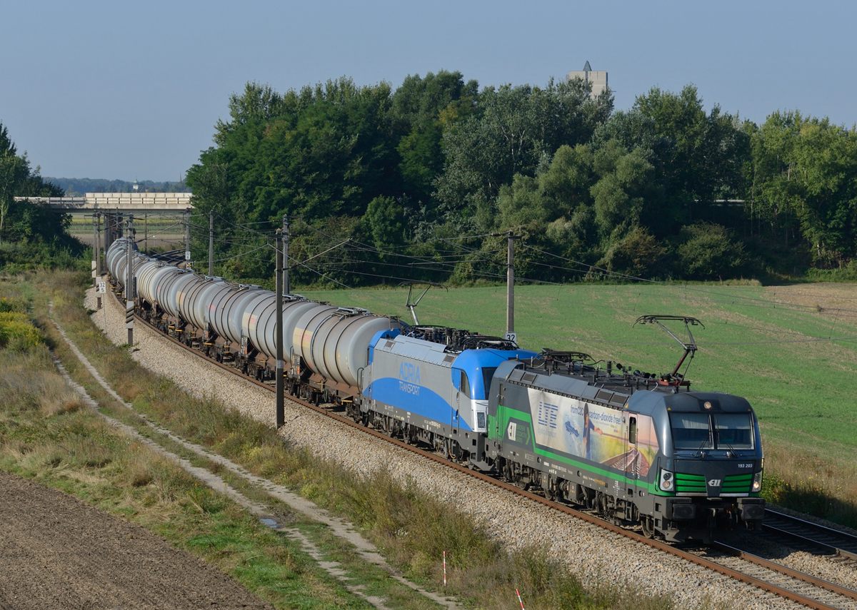 193 203 und 1216 920 waren am frühen Morgen des 25. August 2016 mit dem Kesselwagenzug 48141 in Richtung Gramatneusiedl unterwegs, und wurde von mir bei Wampersdorf fotografiert.