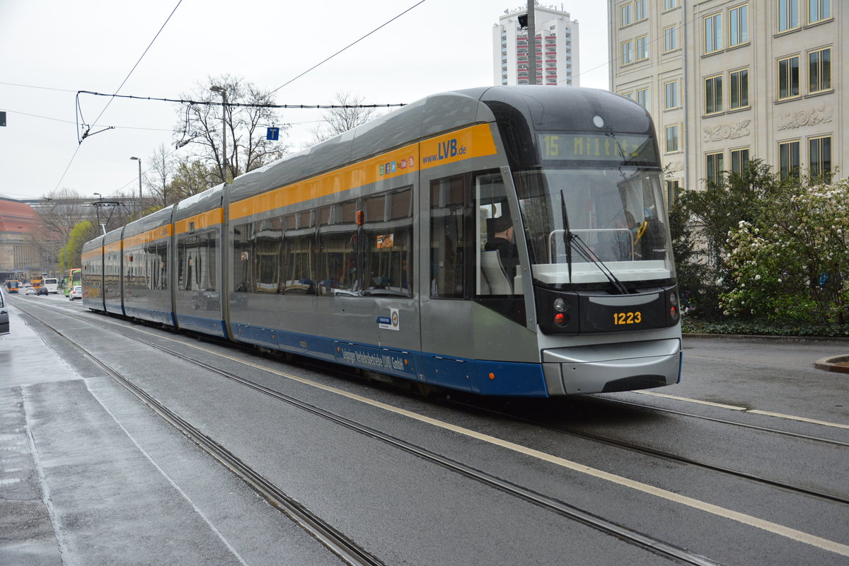 Diese Straßenbahn  1223 - NGT12  fährt am 15.04.2016 auf der Linie 15. Aufgenommen zwischen Hauptbahnhof und Augustusplatz in Leipzig.