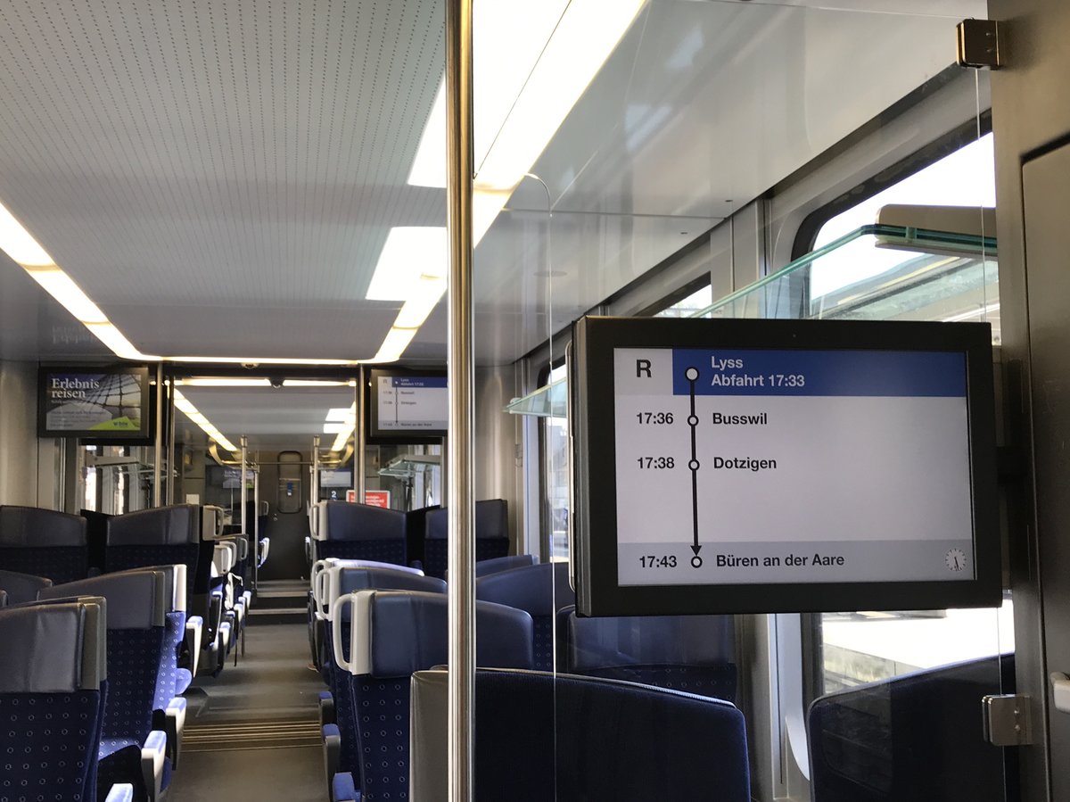 Der Lötschberger 121 mit dem FIS Refit hat jetzt auch die gleichen Bildschirme und System wie der Mutz aber noch ein zusätzlicher Bildschirm mit Werbung und News, am 12.4.17 in Lyss.