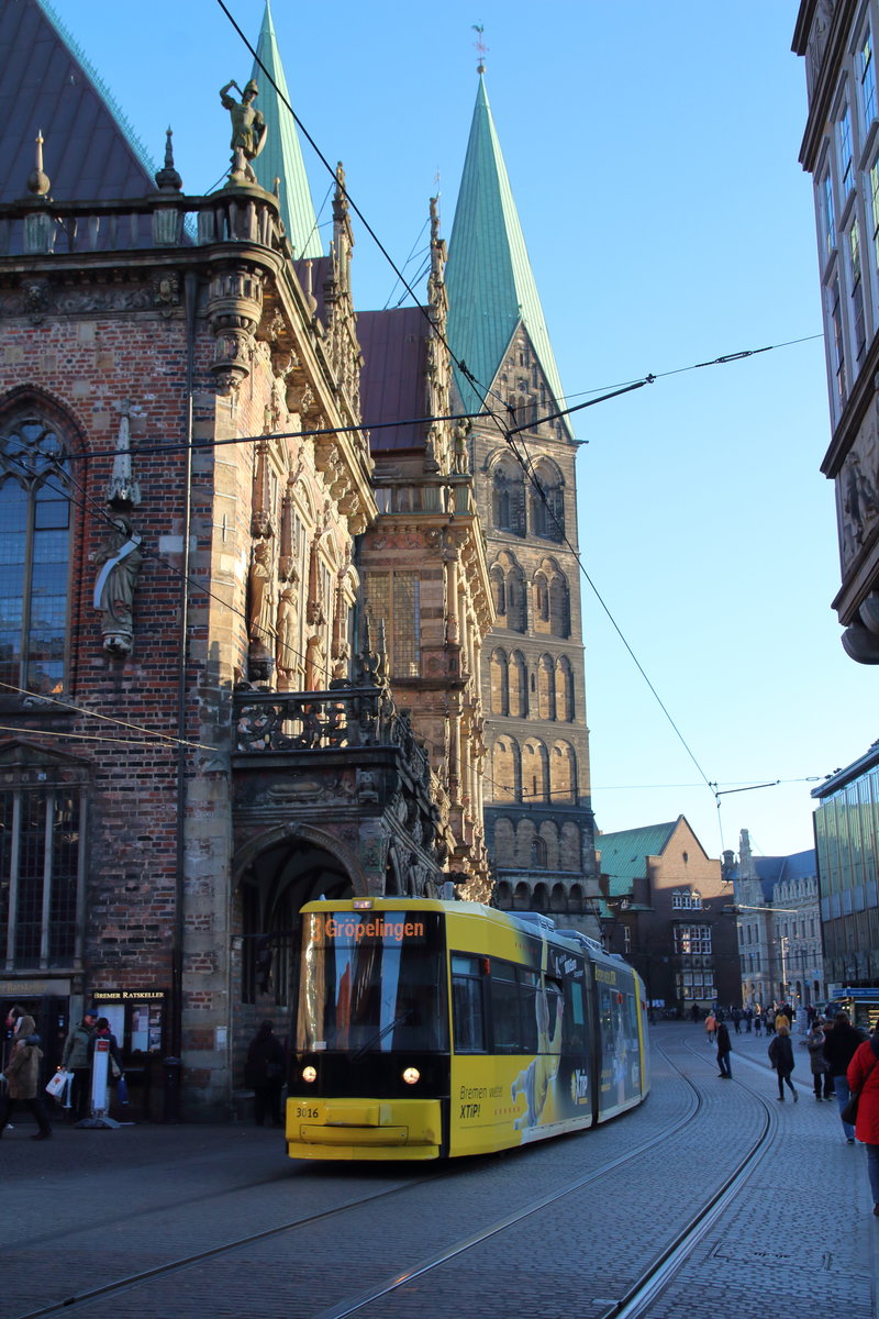 Eine Tram der Linie 3 (Weserwehr - Gröpelingen) auf dem Weg durch die Bremer Innenstadt. Zu diesem Bild gab es einen Verbesserungsvorschlag, den ich natürlich nachvollziehen kann. Es ging um die abgeschnittene Turmspitze. Leider habe ich darauf nicht geachtet und wiederholen kann ich das Bild erstmal nicht mehr... Bremen, 29. Dezember 2016