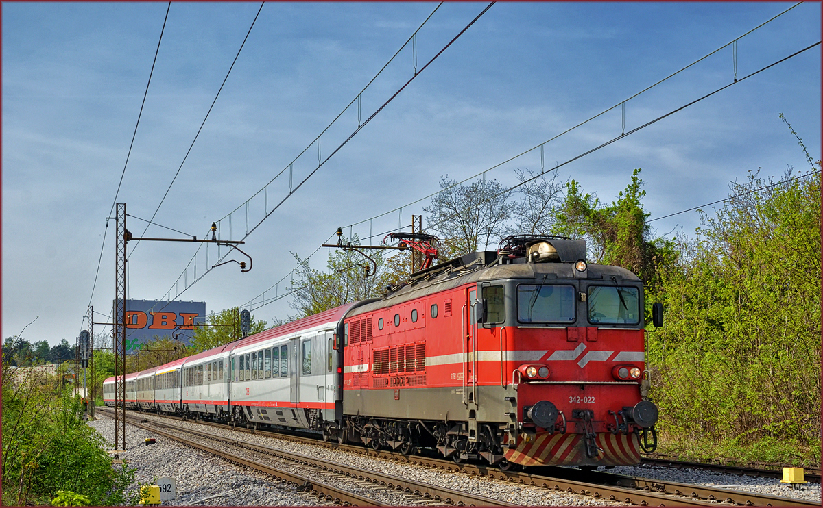 SŽ 342-022 zieht EC158 durch Maribor-Tabor Richtung Wien. /12.4.2017