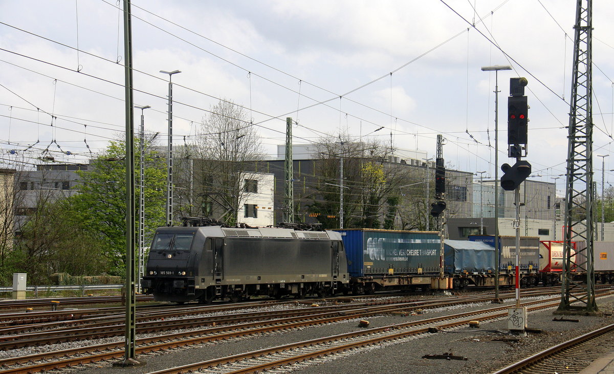 185 569-1 von MRCE/SBB-Cargo kommt aus Richtung Köln,Aachen-Hbf,Aachen-Schanz mit einem langen Containerzug aus Gallarate(I) nach Antwerpen-Oorderen(B) und fährt in Aachen-West ein.