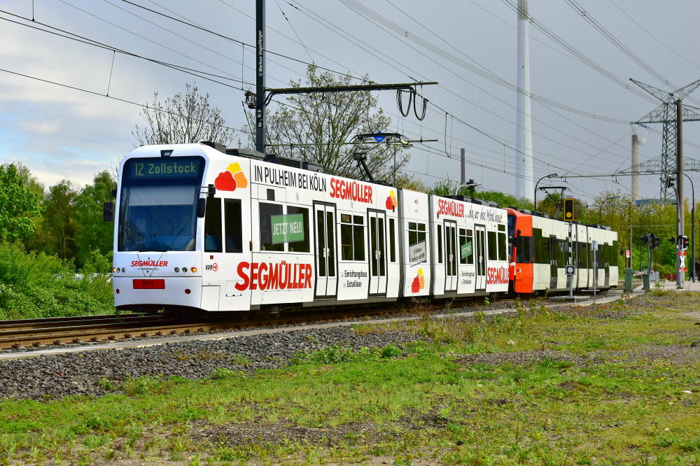 Niederflurwagen 4517 wurde eine neue Ganzreklame für das Möbelhaus "Segmüller" angebracht. Hier zu sehen kurz vor der Haltestelle Zollstockgürtel am 15.04.2017.