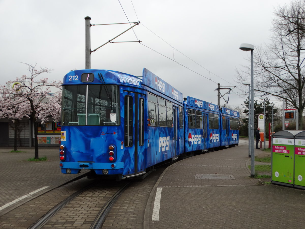 Freiburger VAG Düwag GT8K Wagen 212 mit Pepsi Vollwerbung am 22.03.17 in Haid als Fahrschule