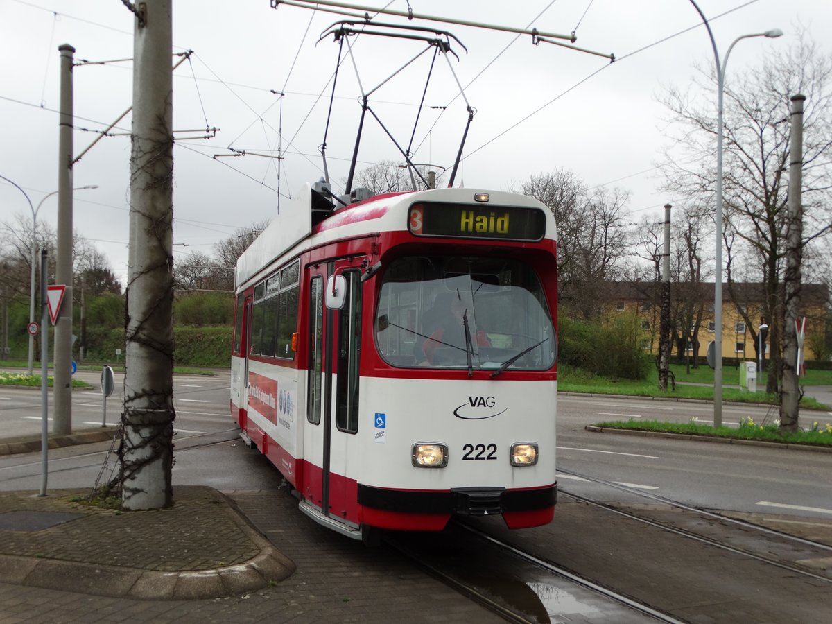 Freiburger VAG Düwag GT8K Wagen 222 am 22.03.17 in Haid von einer Verkehrsinsel aus fotografiert