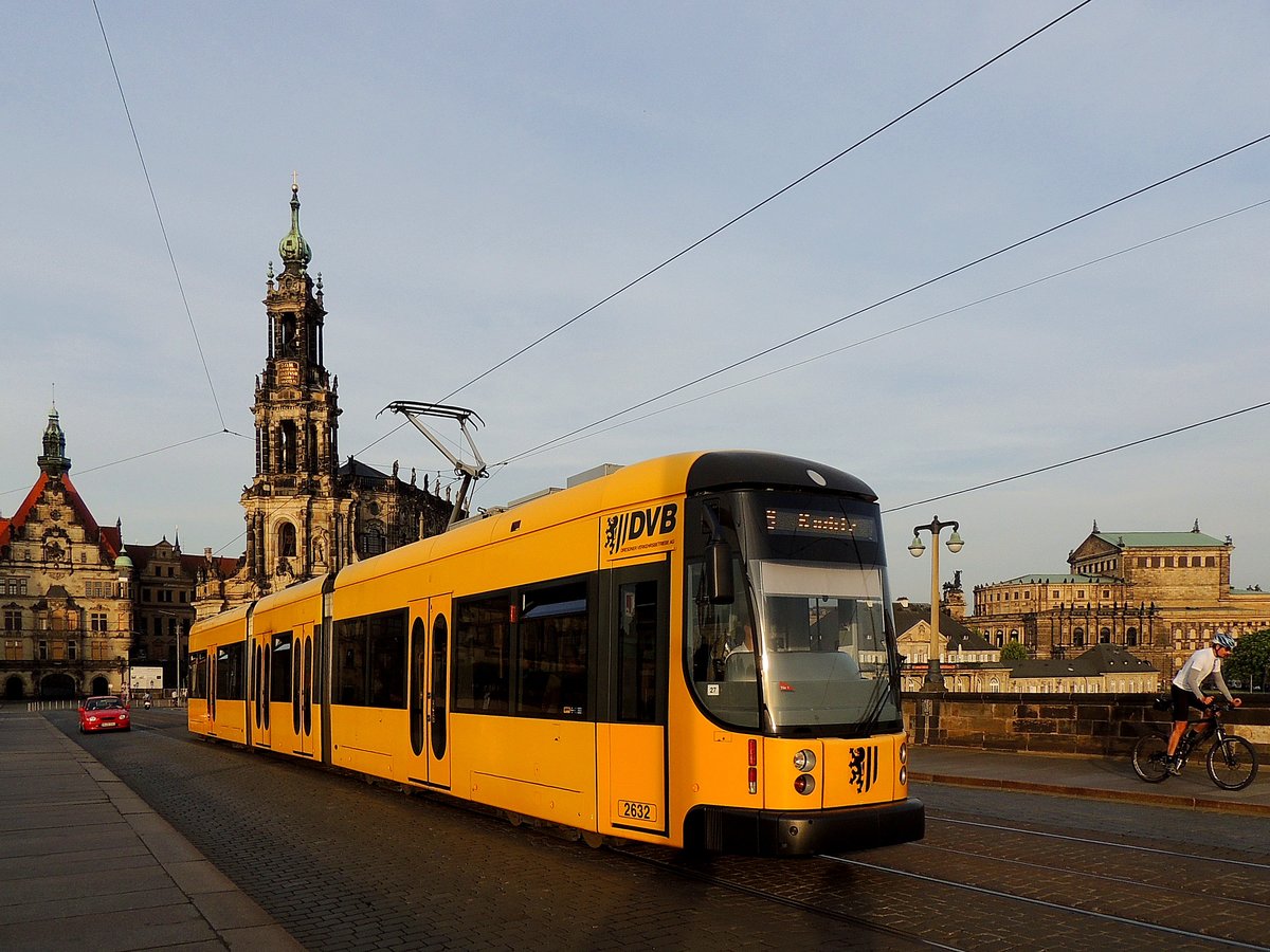 2632 als L5 nach Kaditz, im Rennen mit KFZ und Radfahrer auf der Augustusbrücke in Dresden; 140610