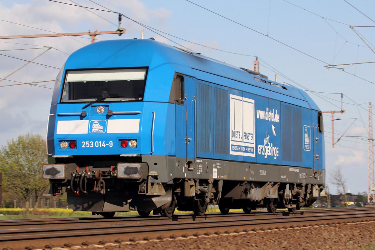 Am 04.04.17 führte 266 005 im Auftrag der HHPI einen langen Schotterzug durch Rodleben Richtung Roßlau.