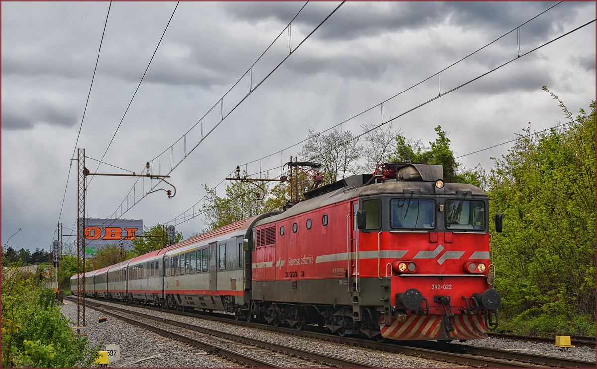 SŽ 342-022 zieht EC158 durch Maribor-Tabor Richtung Wien. /19.4.2017
