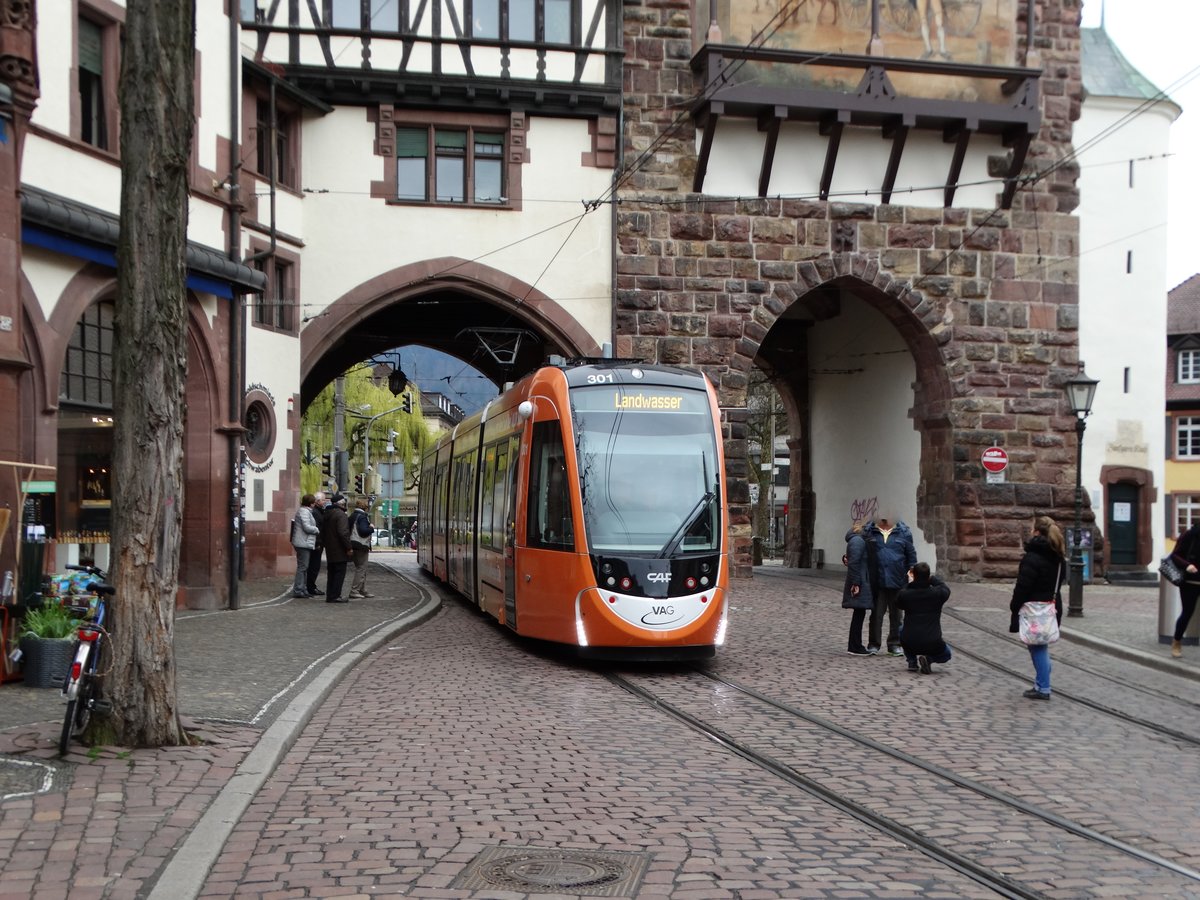 Freiburger VAG CAF Urbos Wagen 301 (Aldi Süd Vollwerbung) am 22.03.17 in der Innenstadt