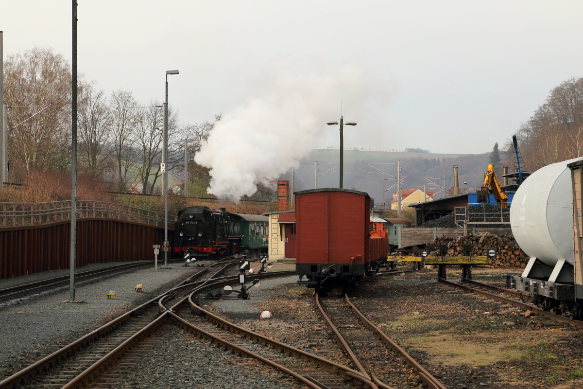 Am frühen Vormittag des 04.04.2016 fährt 99 1734 mit P5001 aus Dippoldiswalde in den Bahnhof Freital-Hainsberg ein. (Bild 1) Da die Einfahrt in einer Steigung liegt, muß nochmal etwas Dampf gegeben werden.